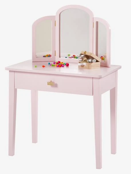 Pour votre petite princesse en devenir, voici la coiffeuse rêvée de toutes les petites filles ! Toute rose, avec un miroir triptyque pour se pomponner, un grand tiroir pour garder les secrets et une poignée en forme de couronne pailletée… On en connait une qui va faire des jalouses !